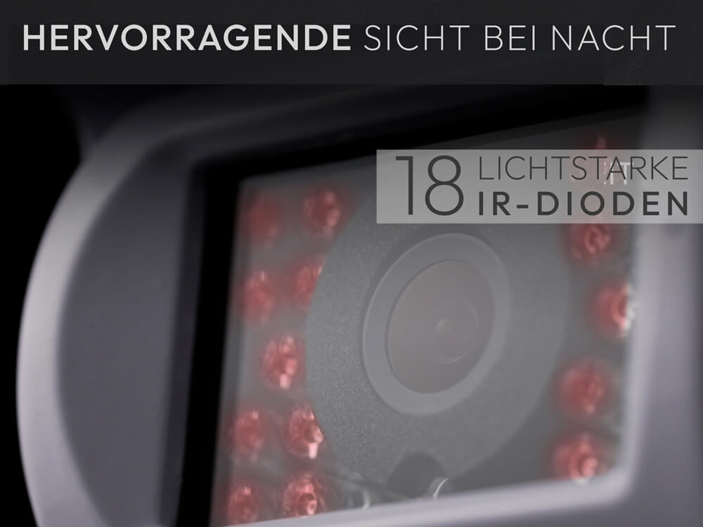 Die Rückfahrkamera bietet mit 18 IR-LEDs eine starke Nachtsicht. Selbst bei völliger Dunkelheit sehen Sie, was hinter dem Fahrzeug passiert – ideal auf unbeleuchteten Stellplätzen.