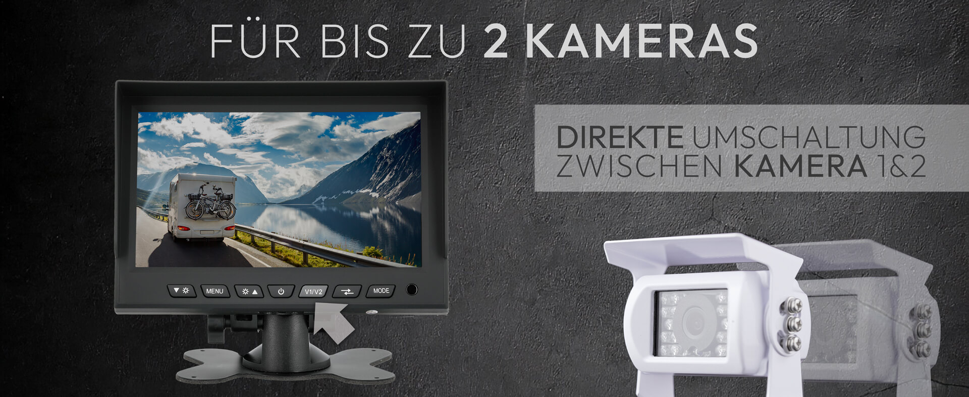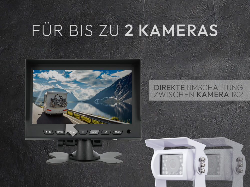 An den Monitor können zwei Kameras angeschlossen werden – zum Beispiel für Rück- und Frontansicht. So behalten Sie beim Rangieren oder Fahren immer den Überblick.