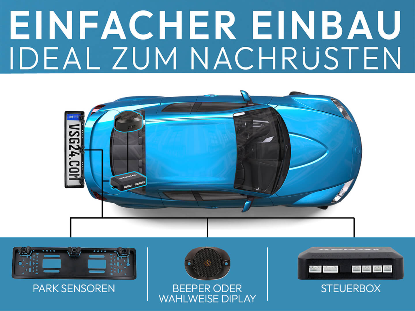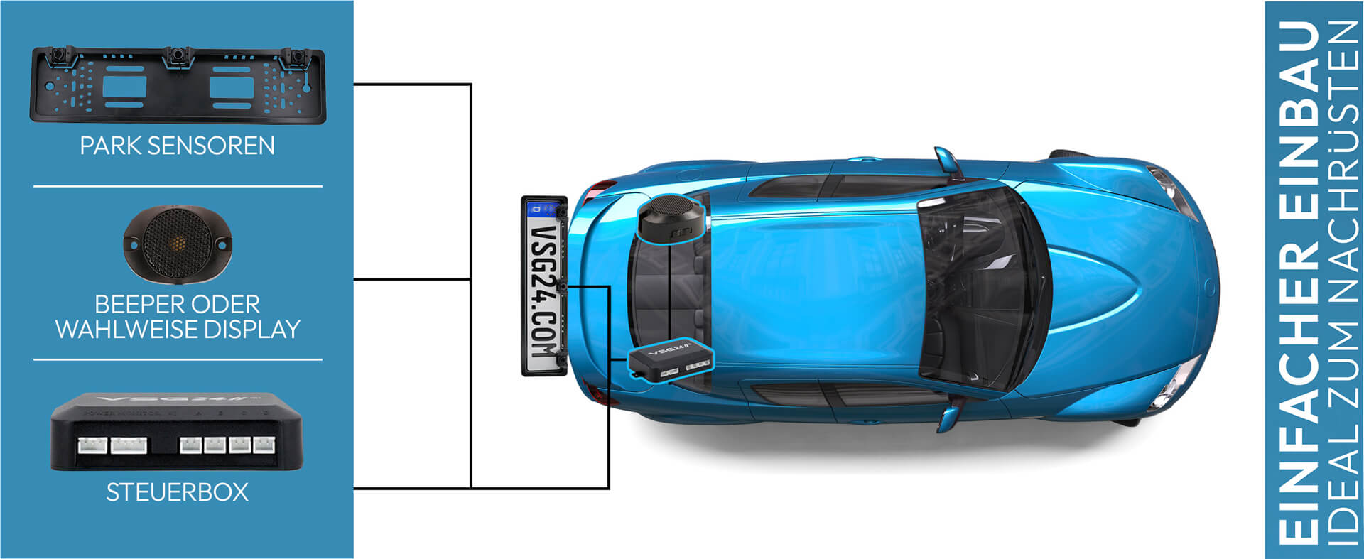 Einfach. Sicher. Komfortabel. Die Nummernschild-Einparkhilfe von VSG24 unterstützt Sie zuverlässig beim Rangieren und Manövrieren unter engen Bedingungen. Das Nachrüstsystem kann wahlweise im Front- oder Heckbereich installiert werden und eignet sich für nahezu alle Fahrzeugtypen – vom Kleinwagen über SUV und Kombi bis hin zum Transporter. Ein CAN-Bus-Filter ist im Lieferumfang enthalten und sorgt für einen störungsfreien Betrieb in allen Fahrzeugen mit 12-Volt-Bordspannung, unabhängig von Marke oder Modell. Dank unauffälliger Montage bleibt das Fahrzeugdesign erhalten, während präzise Sensoren Hindernisse frühzeitig erkennen und zuverlässig warnen. Im Lieferumfang sind ein LED-Display sowie ein Lautsprecher enthalten, sodass die Warnung visuell oder akustisch erfolgen kann. Ein zusätzlicher Schalter zur manuellen Aktivierung ermöglicht den flexiblen Einsatz genau dann, wenn Unterstützung benötigt wird. Eine durchdachte Nachrüstlösung – effektiv, dezent und sofort einsatzbereit.