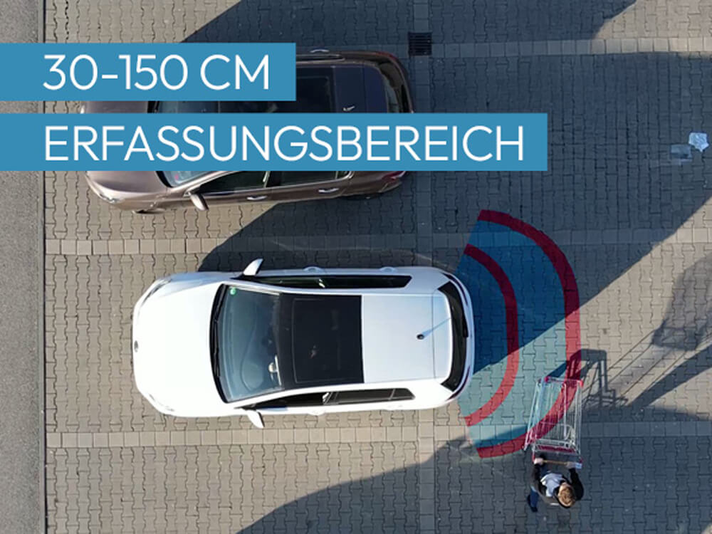 Die Sensoren überwachen zuverlässig einen Abstand von 30 bis 150 cm. Selbst kleine oder bewegliche Hindernisse werden frühzeitig erkannt - mehr Sicherheit beim Rückwärtsfahren, Rangieren und Einparken.