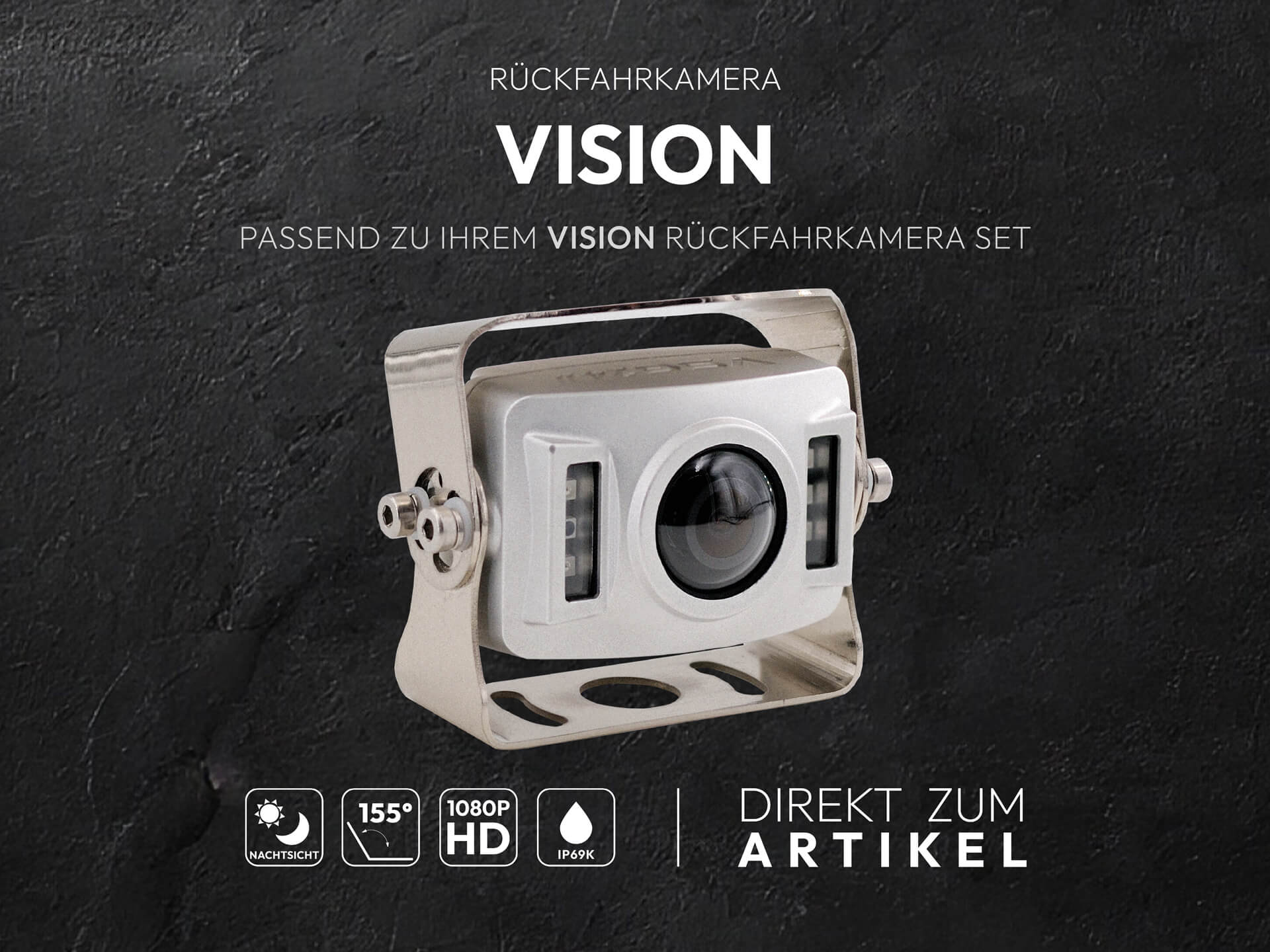 155° Ultra-Weitwinkel Der besonders große 155° Blickwinkel reduziert tote Winkel erheblich und sorgt für optimale Übersicht – selbst bei großen Fahrzeugen oder breiten Aufbauten.
