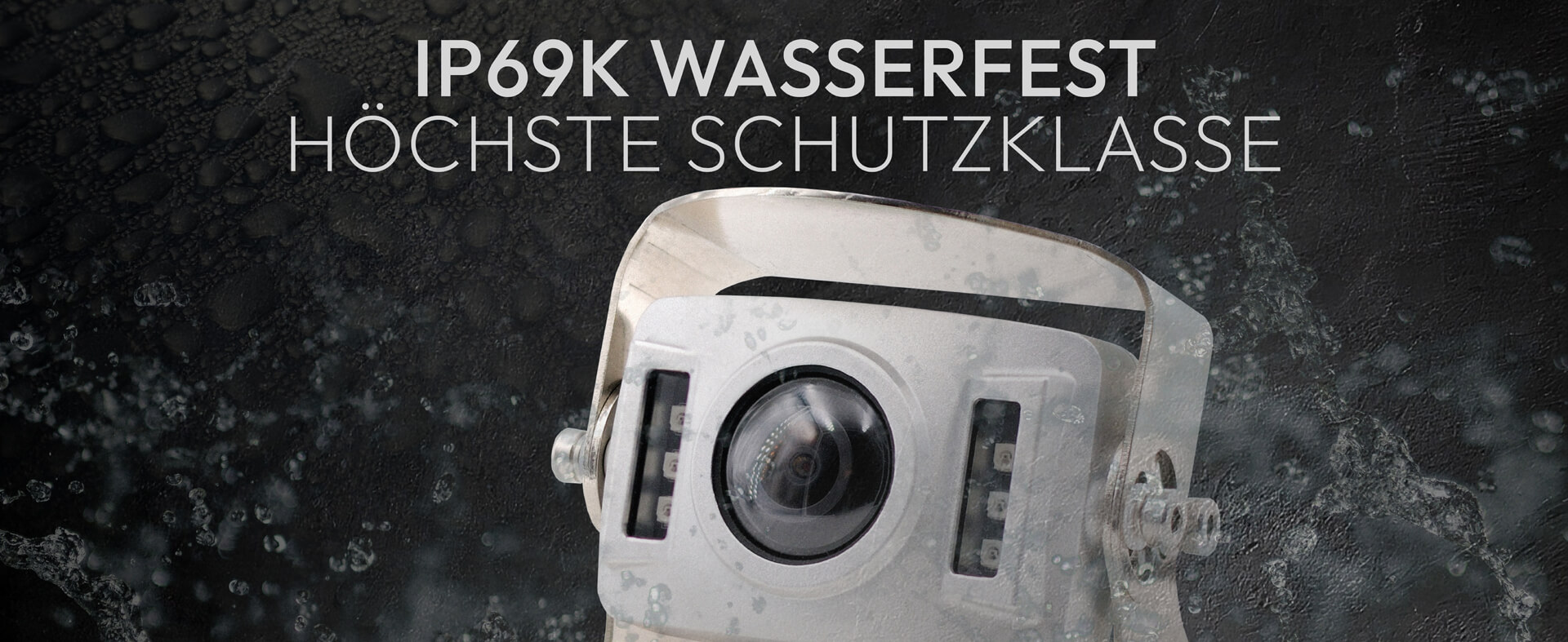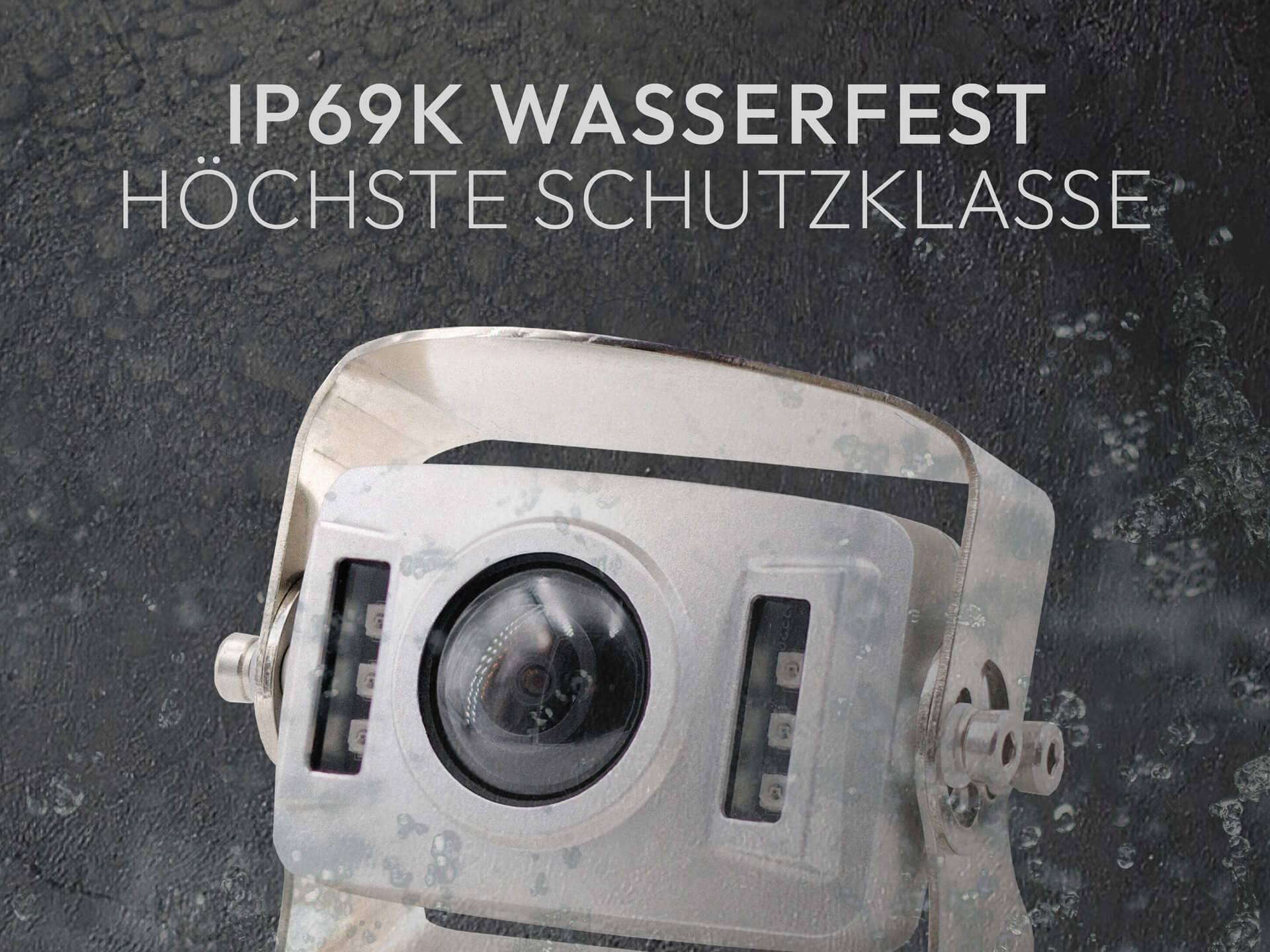 Das robuste Vollaluminium-Gehäuse mit Edelstahlhalterung und Sonnenschutzblende erfüllt die höchste Schutzklasse IP69K. Absolut wasser- und staubdicht – selbst Hochdruckreiniger stellen kein Problem dar.