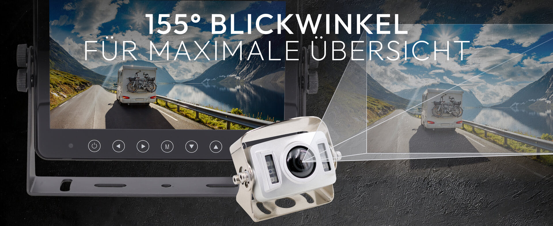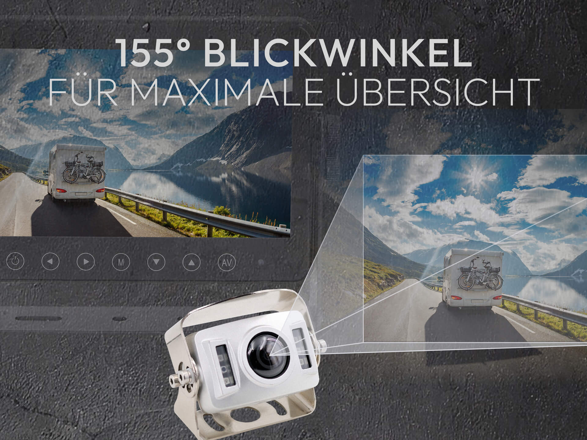 Der besonders große 155° Blickwinkel reduziert tote Winkel erheblich und sorgt für optimale Übersicht – selbst bei großen Fahrzeugen oder breiten Aufbauten.