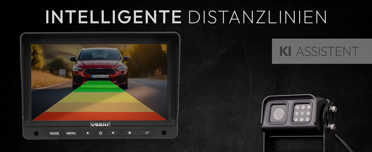 Intelligente Distanzlinienanzeige Das System ermittelt automatisch den Abstand zu Hindernissen und zeigt ihn visuell im Kamerabild an – über farbliche Markierungen oder dynamische Balken. Intuitiv und zuverlässig.