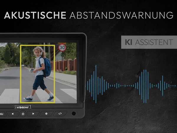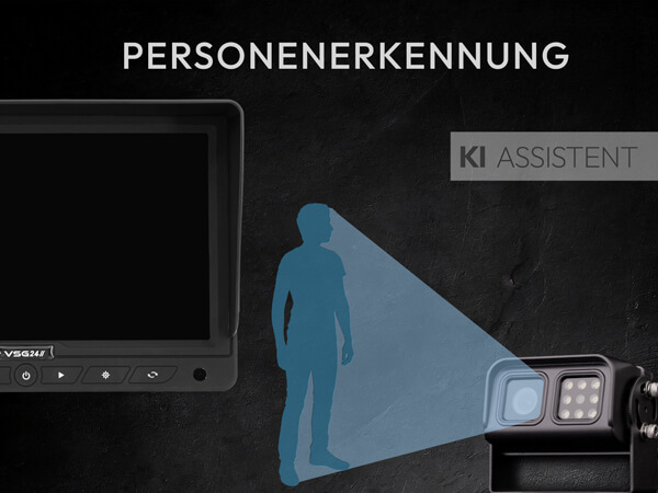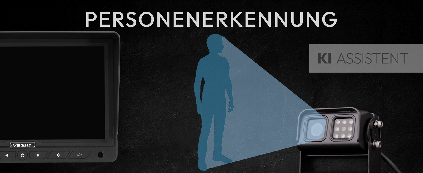 KI-Kamera mit Personenerkennung Erkennt Personen im Gefahrenbereich automatisch und warnt mit akustischem Signal – mehr Sicherheit beim Rückwärtsfahren in Werkhöfen, Wohngebieten oder auf dem Campingplatz.