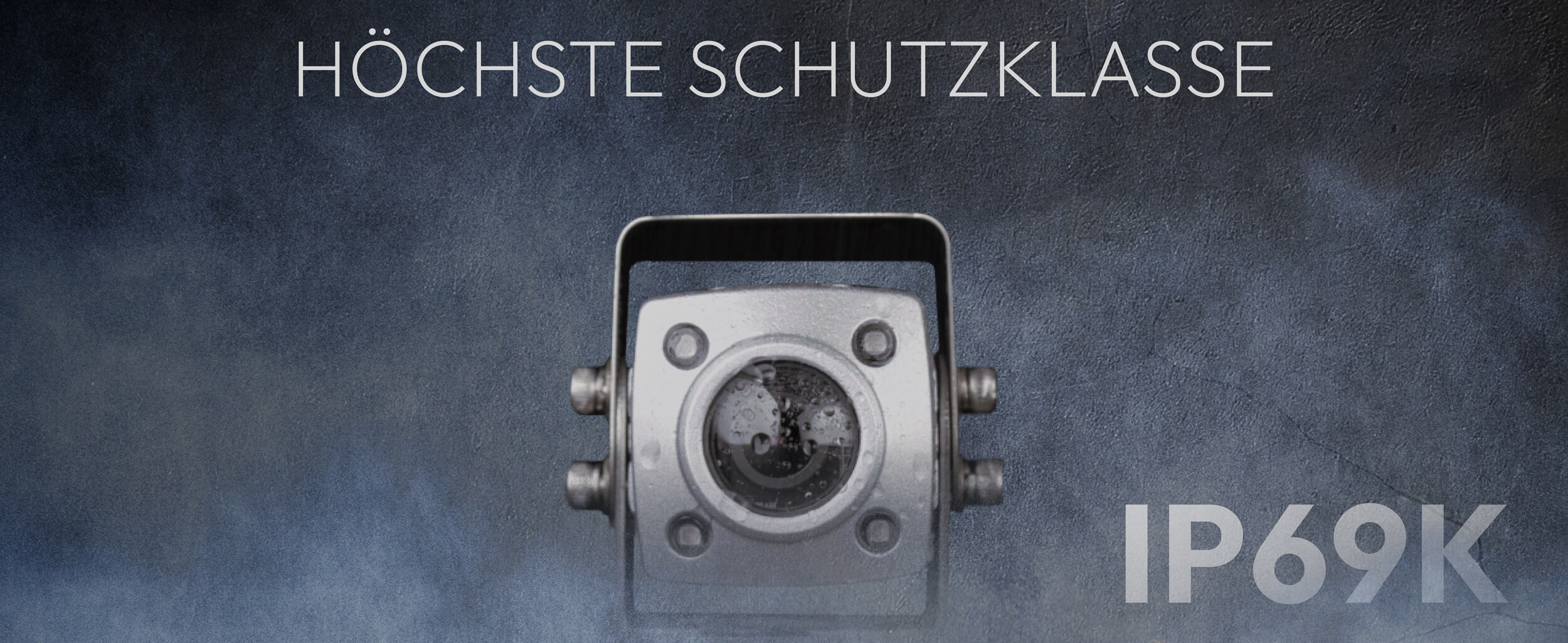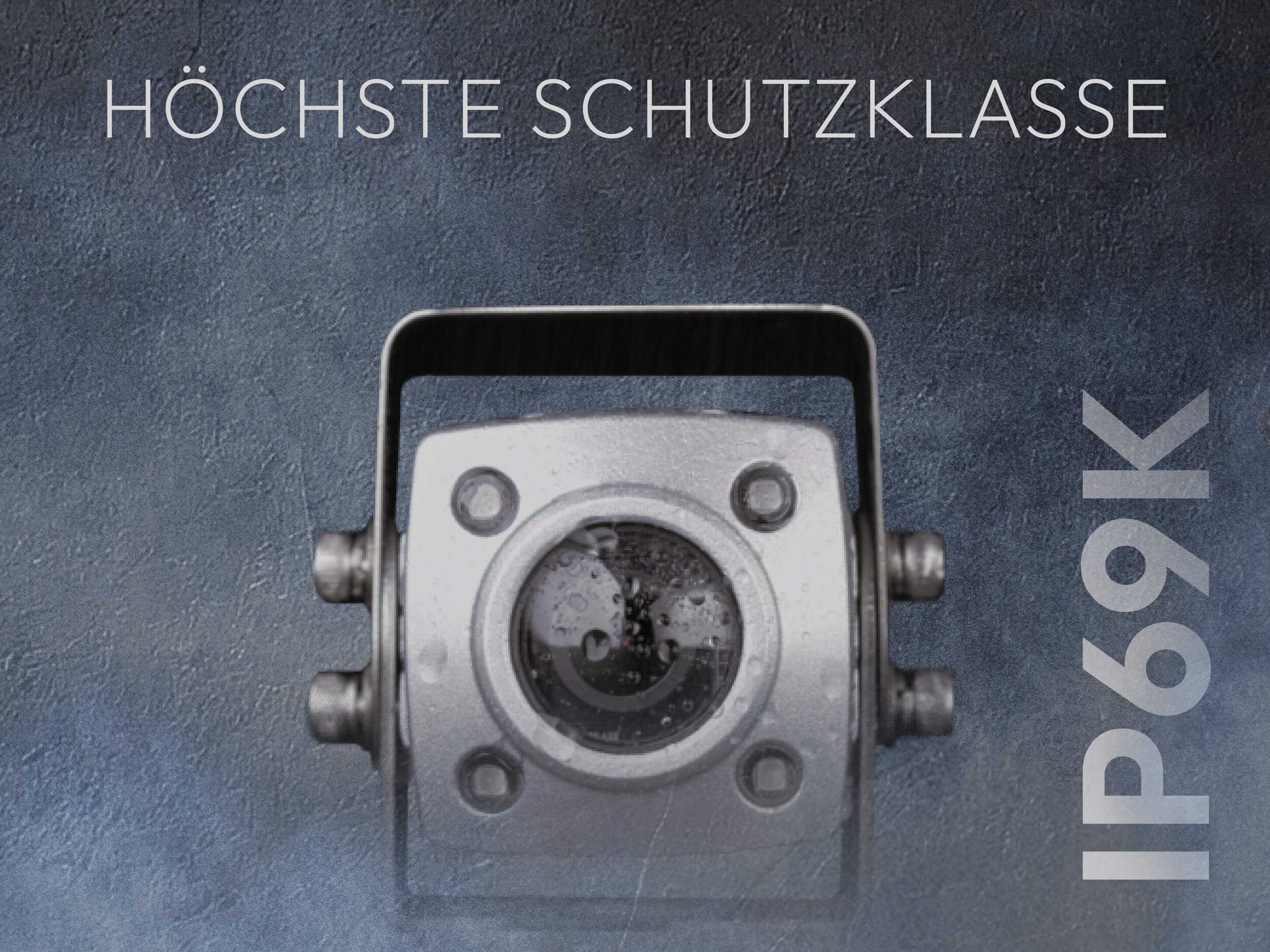 Höchste Schutzklasse IP69K Absolut dicht gegen Staub, Wasser und Schmutz. Dank integrierter Heizung bleibt die Kamera auch bei eisigem Wetter und Frost jederzeit zuverlässig einsatzbereit.