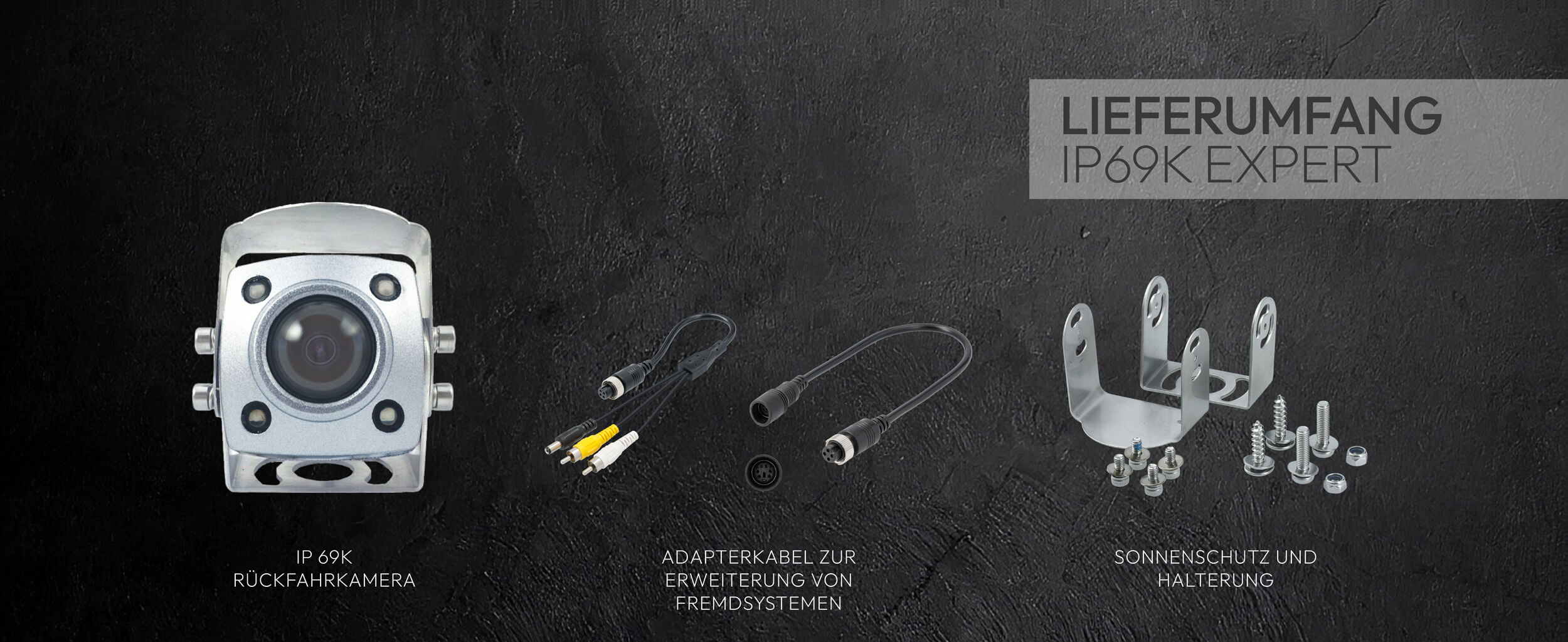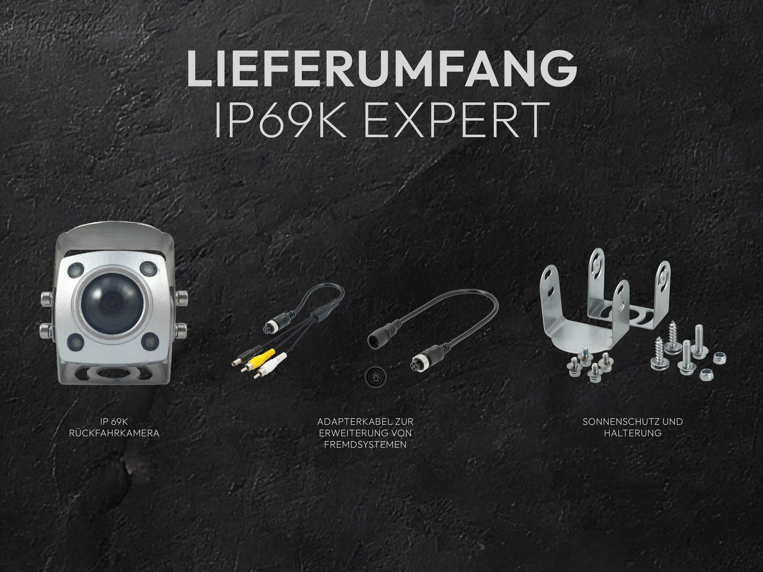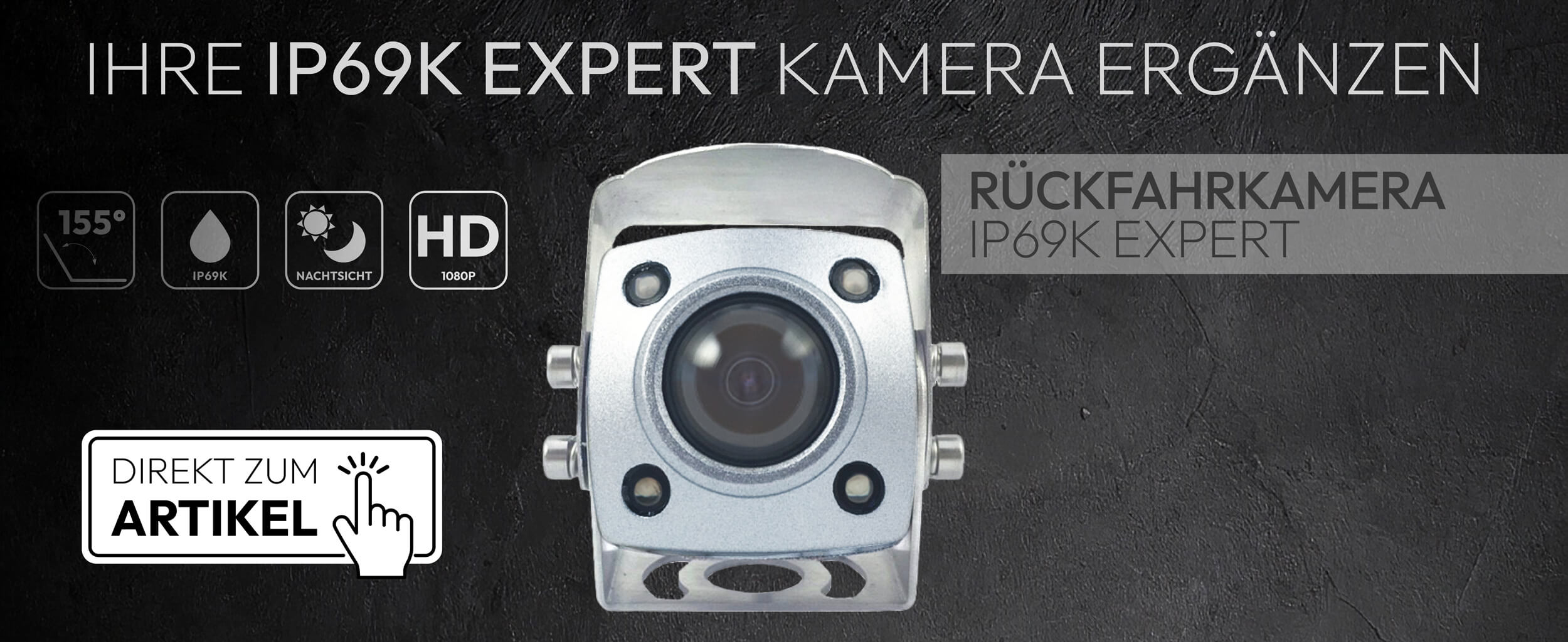 EXPERT Rückfahrkamera IP69K Die EXPERT Rückfahrkamera IP69K wurde für anspruchsvolle Anwendungen im privaten und gewerblichen Bereich entwickelt und kombiniert robuste Technik mit intelligenter Assistenz. Eine integrierte Personenerkennungsfunktion erkennt Personen im Gefahrenbereich und warnt den Fahrer sowohl visuell auf dem Monitor als auch akustisch über die Monitorlautsprecher (sofern vorhanden). Zusätzlich sorgt eine integrierte Heizung für zuverlässige Funktion auch bei Frost und niedrigen Temperaturen. Das kompakte Vollaluminiumgehäuse mit Edelstahlhalterung macht die Kamera extrem widerstandsfähig gegenüber Witterung und Erschütterungen. Dank des hohen IP69K-Schutzstandards bleibt sie selbst bei Regen, Staub und extremen Umwelteinflüssen zuverlässig einsatzbereit.