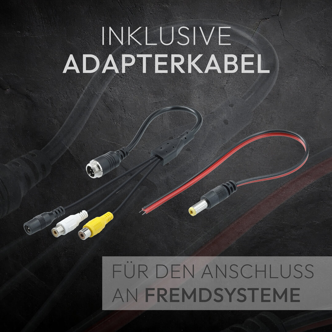 Maximale Monitor-Kompatibilität Mit 4-PIN-Anschluss und beiliegendem Cinch-Adapter ist die Rückfahrkamera mit nahezu jedem Monitor kompatibel. Ideal auch für bestehende Systeme.