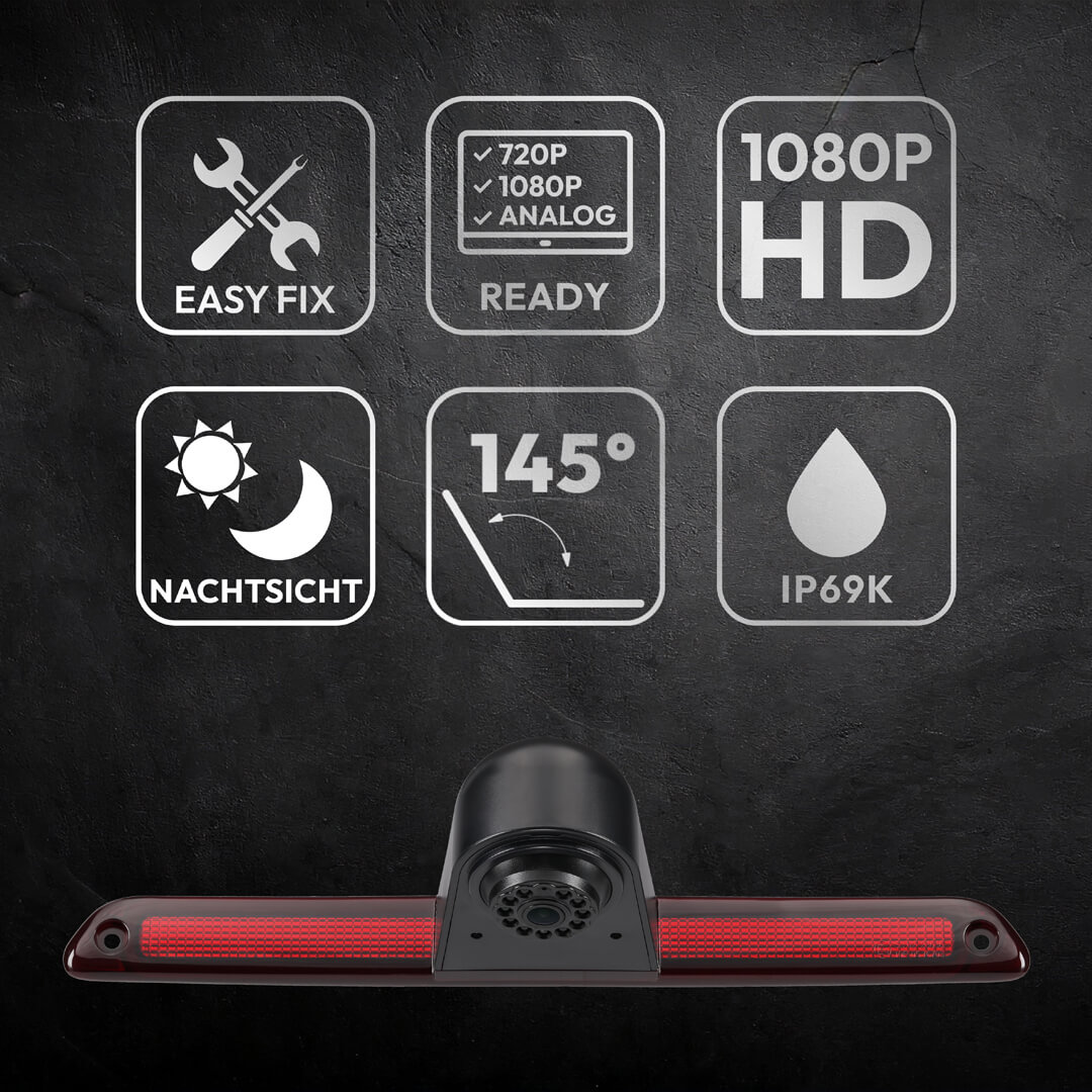 Gestochen scharfe Full-HD-Auflösung Mit 1080P Full-HD liefert die Rückfahrkamera ein klares, detailreiches Bild. Hindernisse werden frühzeitig erkannt – für mehr Sicherheit bei Tag und Nacht.