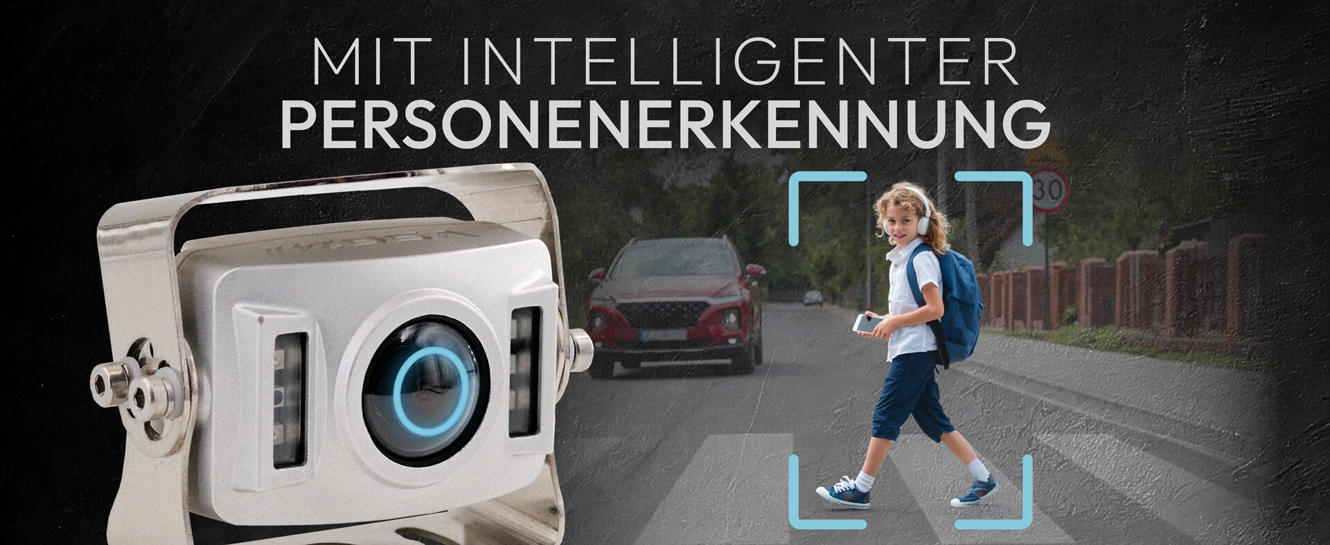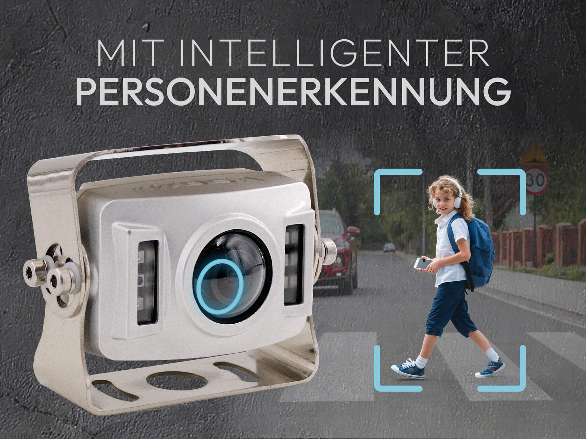 Die integrierte Personenerkennung hebt Gefahren visuell hervor und steigert die Sicherheit beim Einparken oder Rangieren.