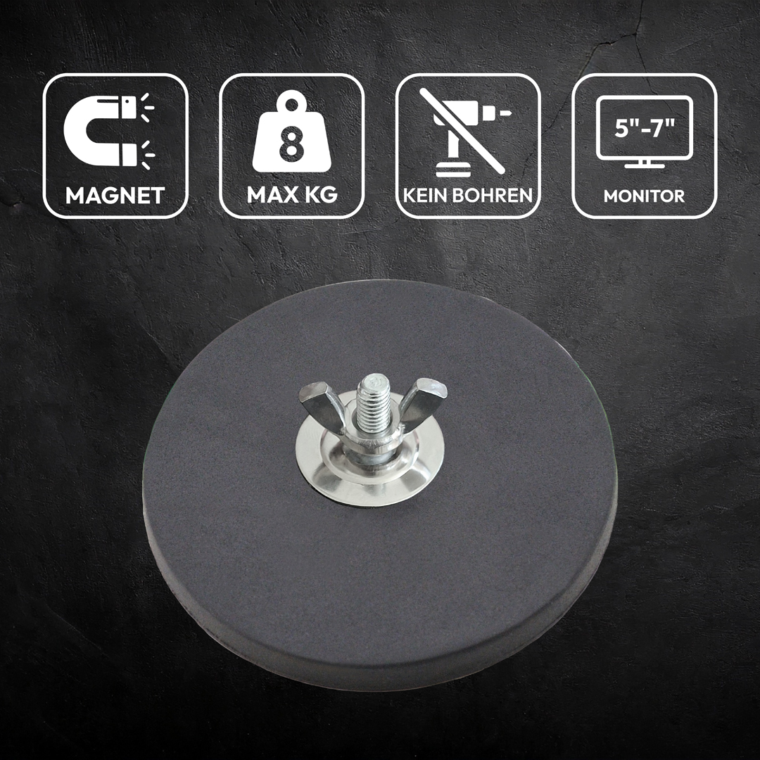 Starke Magnetkraft bis 8 kg Die leistungsstarke Magnetbasis trägt Monitore bis zu 8 kg und sorgt damit für maximale Stabilität. Selbst bei Schlaglöchern oder holprigen Straßen bleibt der Monitor sicher an seinem Platz.