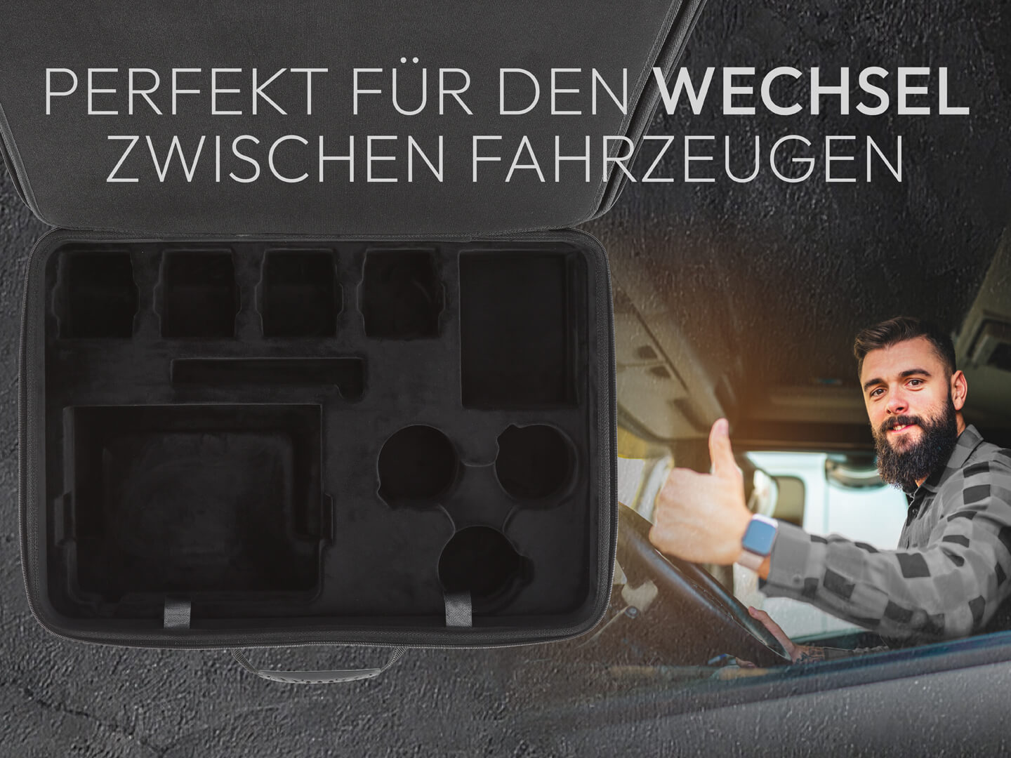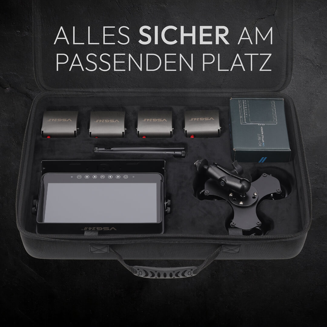 Exakt abgestimmt auf das HORIZON STELLAR PRO XL System Der Koffer wurde speziell für die Komponenten des 10 Zoll HORIZON STELLAR PRO XL Rückfahrkamera Sets entwickelt. Jedes Element sitzt passgenau und sicher an seinem vorgesehenen Platz.